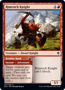 Rimrock Knight // Boulder Rush, Throne of Eldraine, Creature — Dwarf Knight // Instant — Adventure, Common, Red, Pioneer, Modern, Commander, Mana Cost: 1R // R