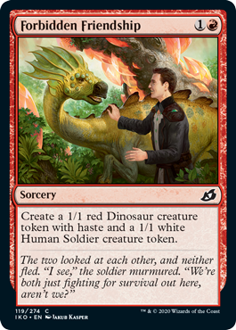 Forbidden Friendship, Ikoria: Lair of Behemoths, Sorcery, Common, Red, Pioneer, Modern, Commander, Mana Cost: 1R