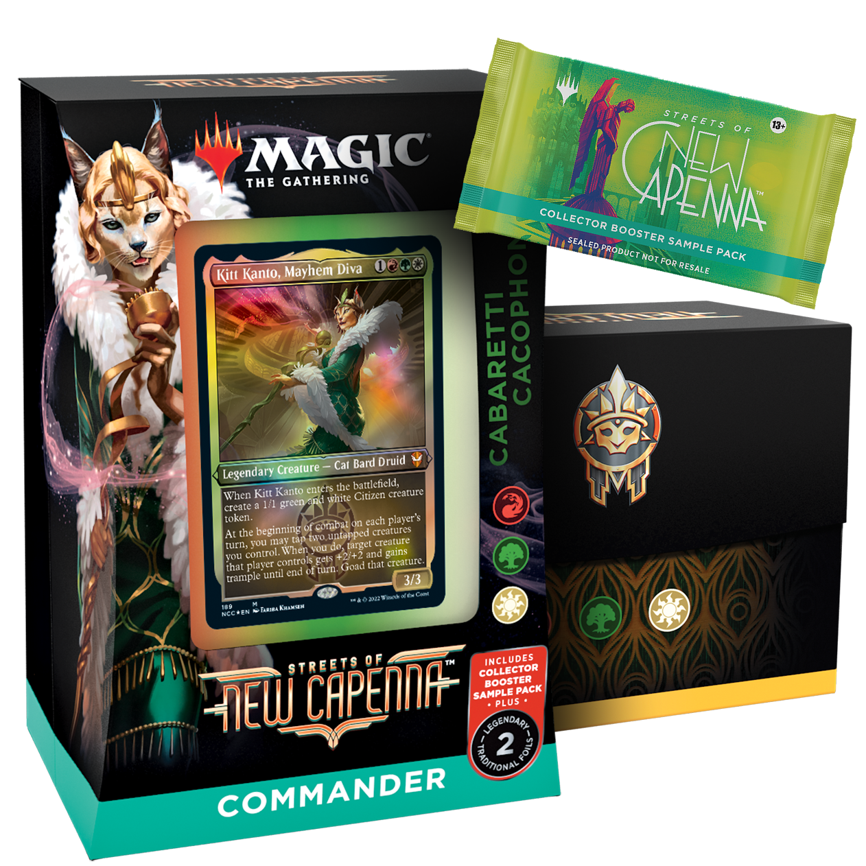 The Cabaretti Cacophony Streets of New Capenna Commander Deck set includes 1 ready-to-play Red-Green-White deck of 100 Magic cards (2 traditional foil, 98 nonfoil), a 2-card Collector Booster Sample Pack, 1 foil-etched Display Commander (a thick cardstock copy of the commander card with foil etched into the card’s border and art), 10 double-sided tokens, 1 counter punchout card, 1 deck box (can hold 100 sleeved cards), 1 life tracker, and 1 reference card.
