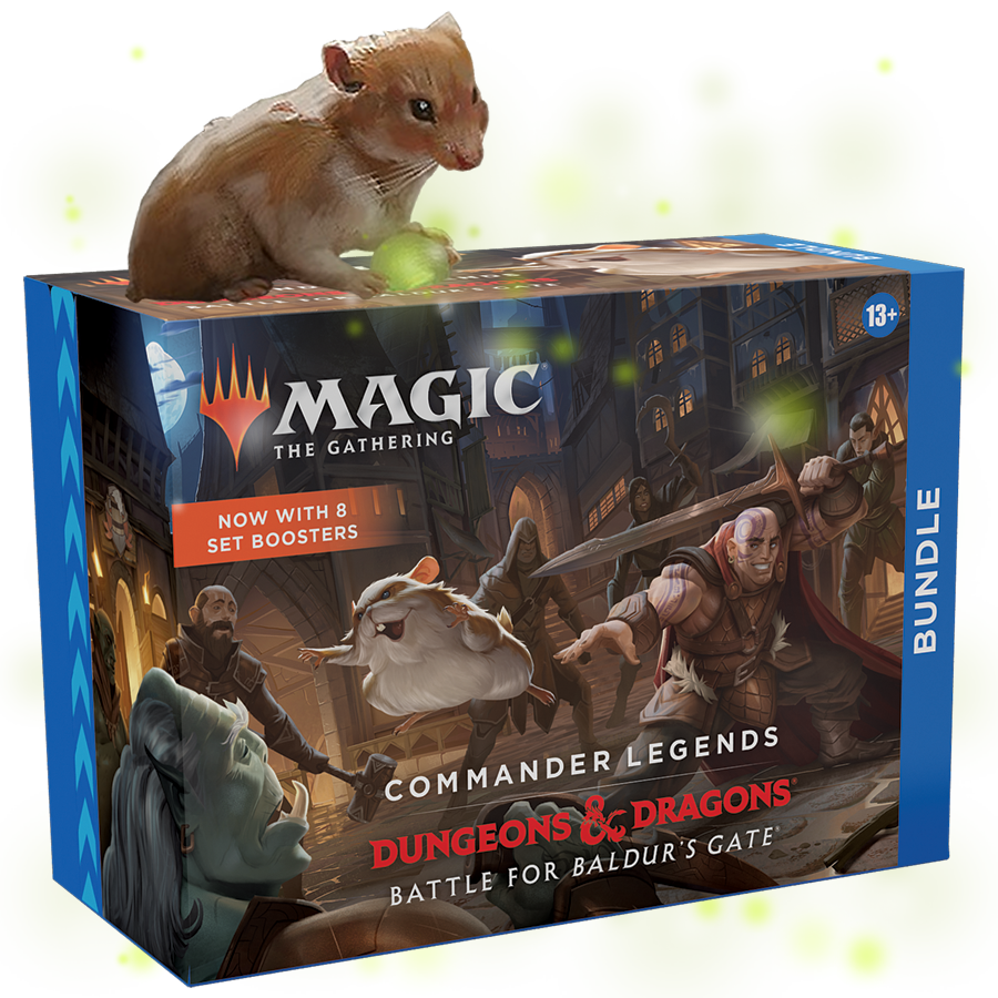 Commander Legends meets D&D in this exciting crossover set! The Commander Legends: Battle for Baldurs Gate Bundle contains 8 Commander Legends: Battle for Baldurs Gate Set Boosters-the best boosters to open just for fun-plus exclusive accessories, with 40 basic lands (20 traditional foils and 20 nonfoils), 1 traditional foil promo card with Bundle-exclusive alternate art, 1 oversized Spindown life counter, 1 card storage box, and 2 reference cards.