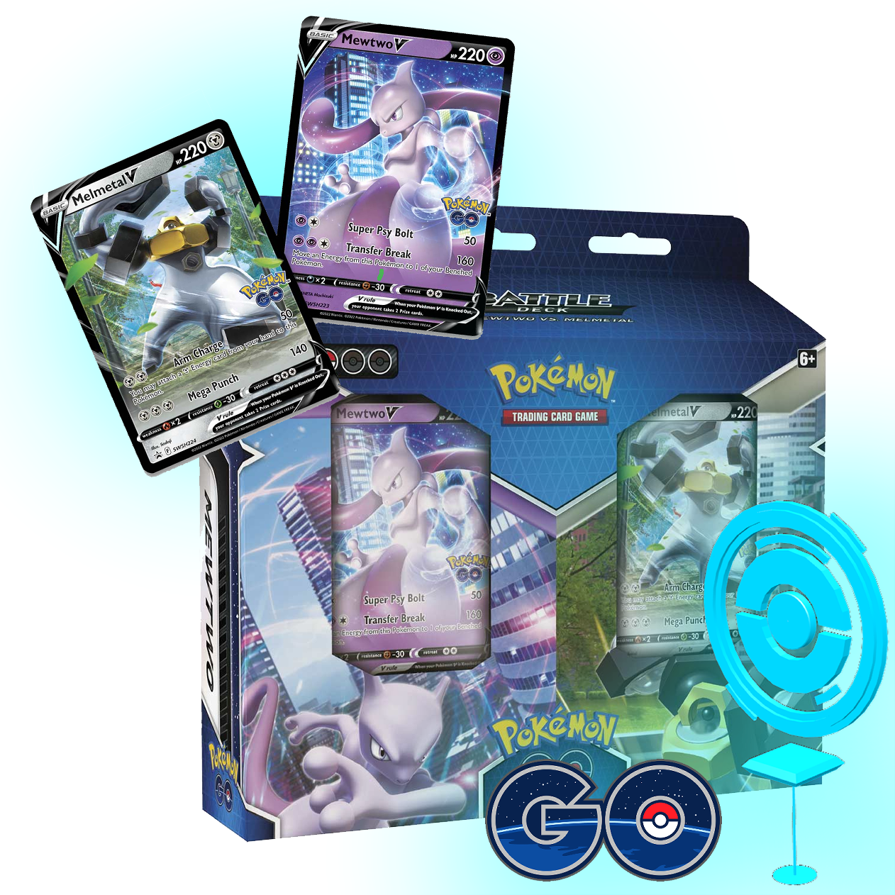 - 2 ready-to-play Pokemon GO V Battle Decks (60 cards each) (Each deck includes a foil Pokemon V: Mewtwo V or Melmetal V)